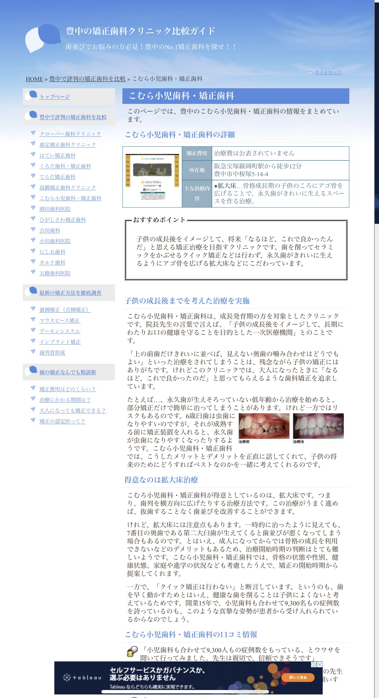 紹介文は書き方こそ丁寧ですが、「治療費は公表されていません」と偽り、「抜歯してヘッドギアとマルチブラケット装置で全体矯正を行ったケース」を「拡大床による部分矯正のケース」などと捏造しています。